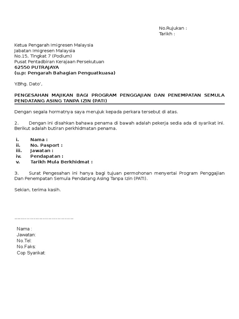 Dato PENGESAHAN MAJIKAN BAGI PROGRAM PENGGAJIAN DAN PENEMPATAN SEMULA PENDATANG ASING TANPA IZIN PATI. Surat permohonan cuti pekerja asing rasmi h.